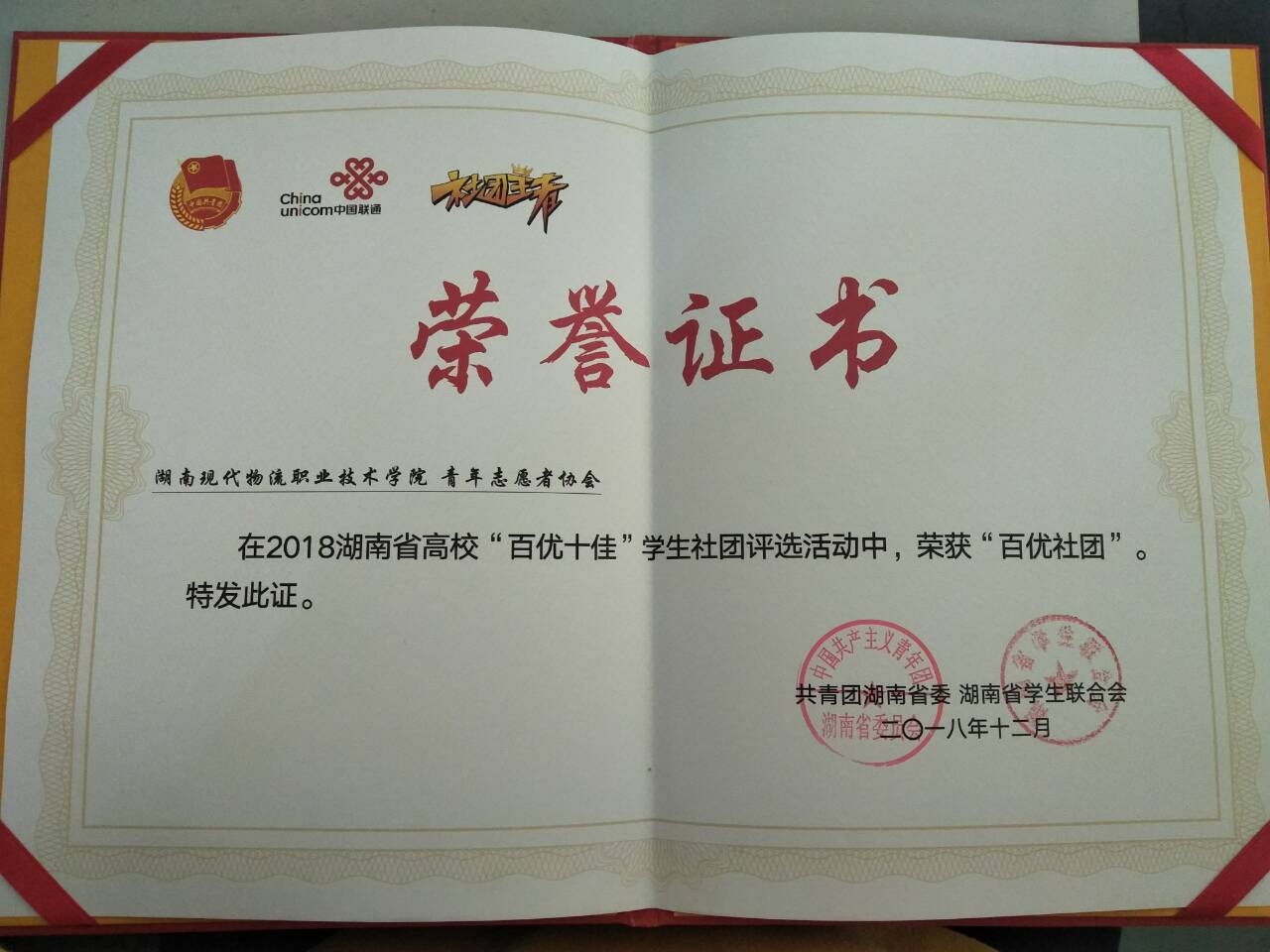 我校青年志愿者协会、物流信息技术协会在全省1400多个本专科高校参评协会中脱颖而出,荣获2018年湖南省“百优社团”荣誉称号。校团委老师陈玮、青年志愿者协会指导老师赵思惠、物流信息技术协会指导老师杨晓峰参加了颁奖典礼,两个协会会长作为代表上台领奖。